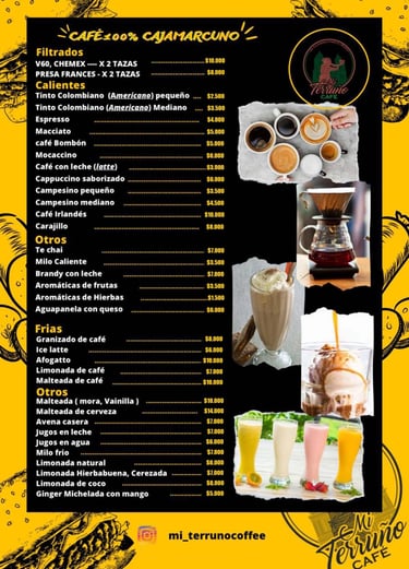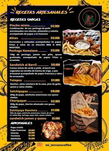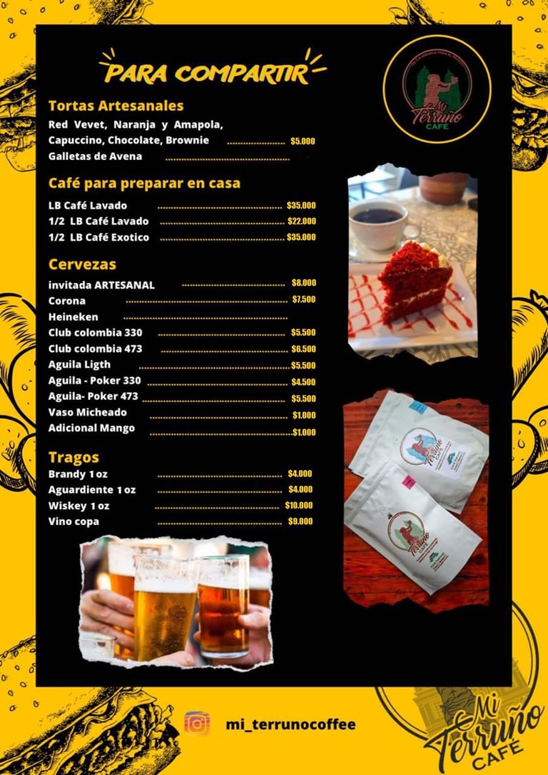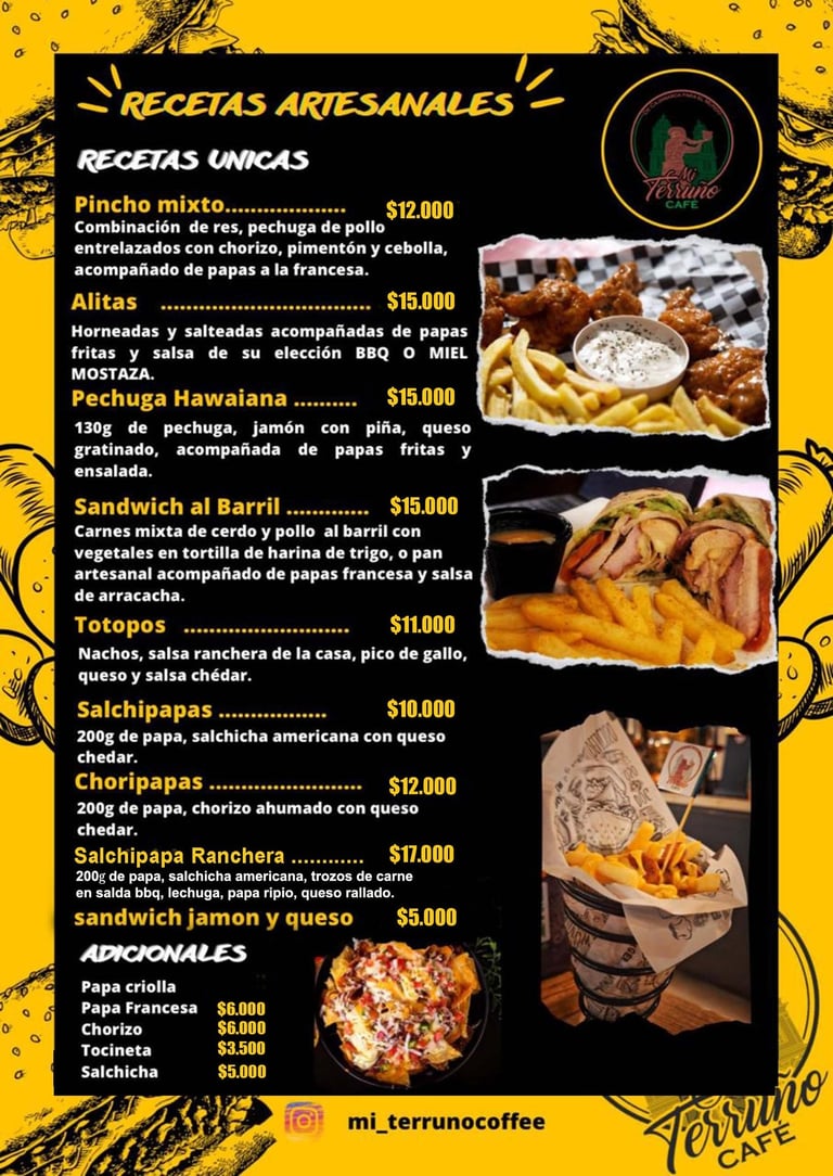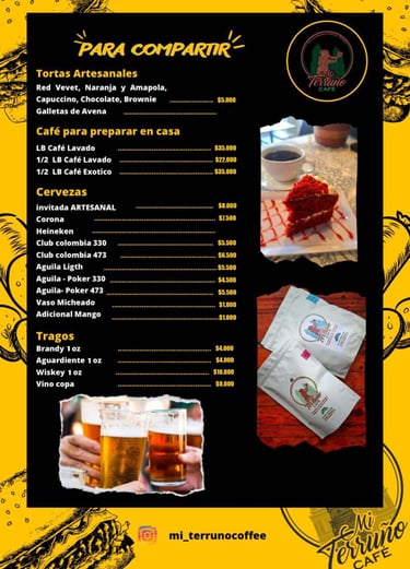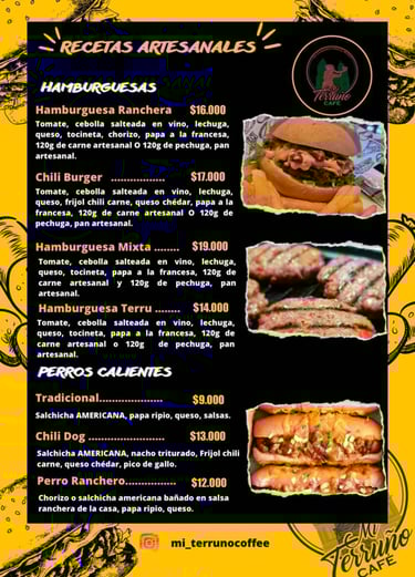 En Mi terruño encontraras, Hamburguesas con carne artesanal, Perros Calientes, Pinchos Mixtos, Alitas, Pechuga, Sandwich, Salchipapas, Tortas, varidad de Bebidas frias, preparaciones a base de cafe 100% de la región, Bebidas con licor y mucho mas...